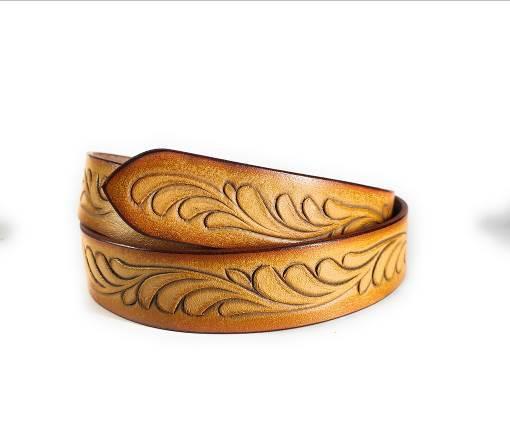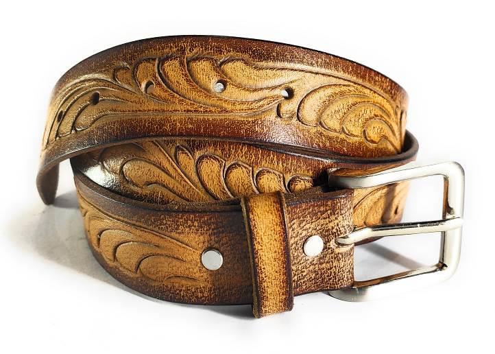 A stylish resin leather belt with intricate western-inspired patterns. Made from premium vegetable-tanned leather.