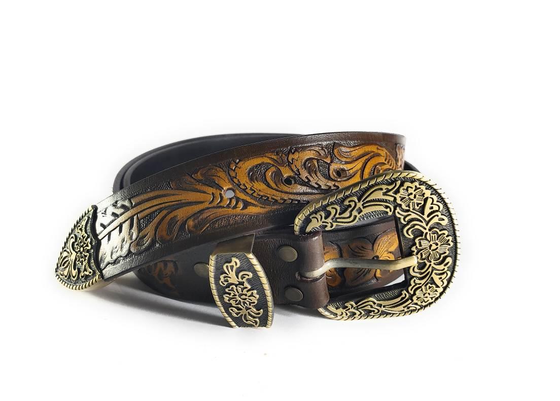Western Pattern Leather Belt. Chrome Free, Nickel & Lead-Free Buckles.